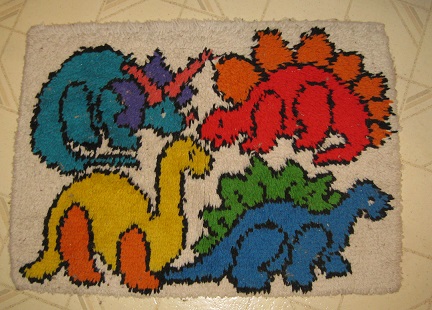 Yes, I made my own bathmat as a kid. Yes, it has colorful dinosaurs. Yes, it keeps my feet warm.