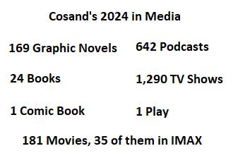 The movies were not as great this year. Nor were the books. I think between those two categories I bought 6 items to keep on my shelves. I do not regret the media I consumed. However, I think most of it could be accurately labeled as, “Fine.”